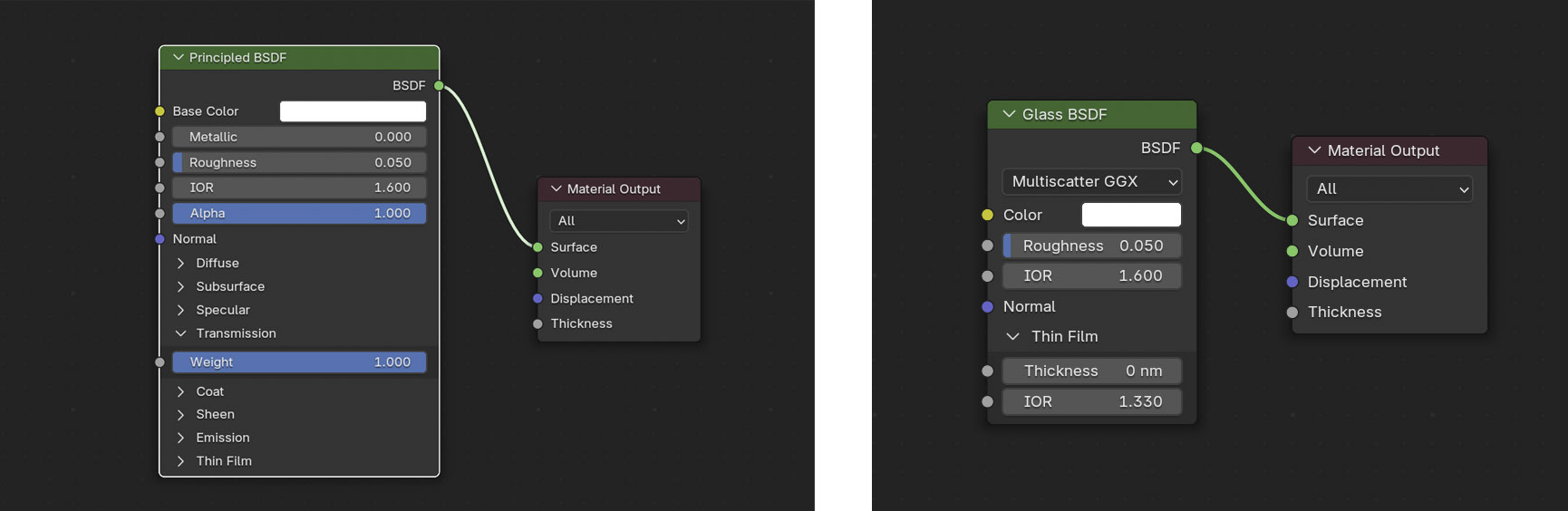 - Thin Film Thickness und Thin Film IOR – simulieren hauchdünne Beschichtungen, wie sie bei optischen Linsen oder entspiegeltem Glas vorkommen. Diese erzeugen subtile, interferenzbedingte Farbspiele auf der Oberfläche und ermöglichen eine noch realistischere Darstellung beschichteter Glasobjekte.